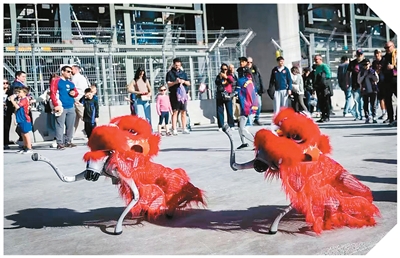 在西班牙巴塞罗那足球俱乐部,两只披着舞狮盛装的机器狗正在表演。巴塞罗那孔子文化学校供图