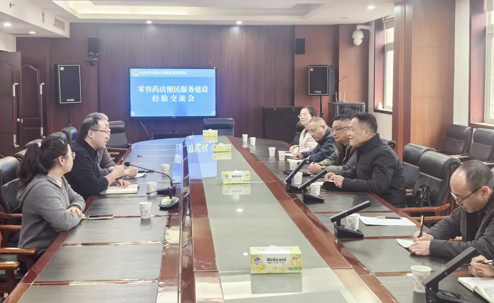 在经验交流会上,开福区市场监管局相关负责人详细介绍了“市民用药服务八大便民举措”推行背景、具体内容及实施成效。近年来,该局坚持“政府引导、企业主体、社会参与”原则,创新推行八大便民举措,至今已有大批药品零售门店踊跃参与,累计为市民提供24小时购药、用药咨询、送药上门等项服务数十万人次。其中,为建档老人免费送药上门服务人次众多,群众满意率平均达90%以上,成功构建起“有呼必应、有疑必答”的药品购销服务新生态。会上,双方围绕药店适老化建设、慢性病健康档案管理、社区与药店联动服务等具体工作进行了深入探讨。