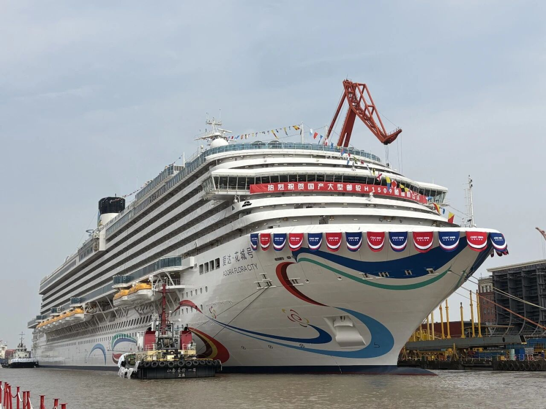 第二艘国产大型邮轮“爱达·花城号”20日在上海出坞,这意味着该船的船体结构完整,已具备航行能力,全面转入码头调试阶段。