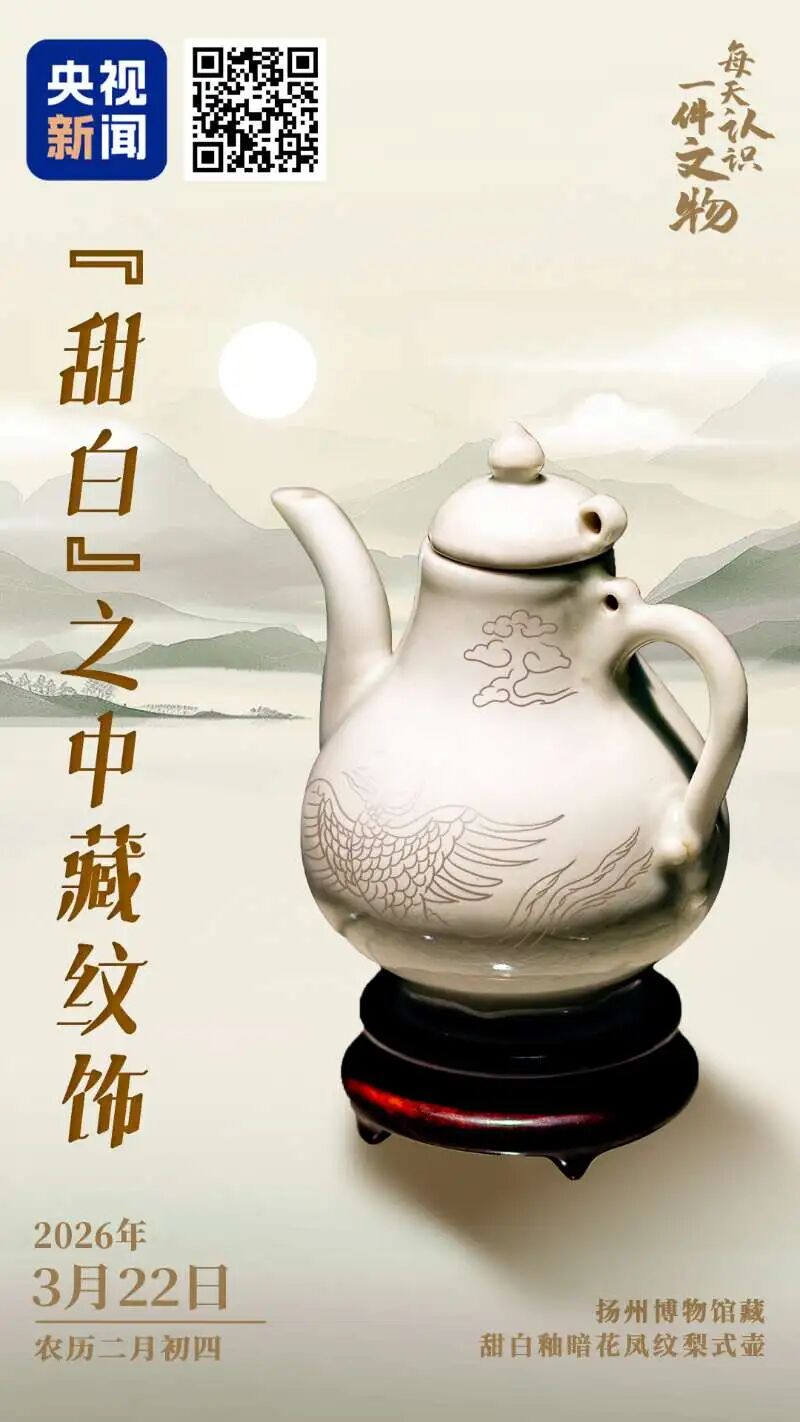 甜白釉暗花凤纹梨式壶,温润如玉、釉面丰腴、细腻洁白、形似鸭梨。这件壶的巧思,不易被发觉,需借助光的流转照射。靠近了看,晶莹剔透的釉面之下,暗刻一对展翅的凤凰;飘逸的凤尾,配合数朵如意云纹,愈加凸显了凤翱翔天际时的轻盈灵动之姿。