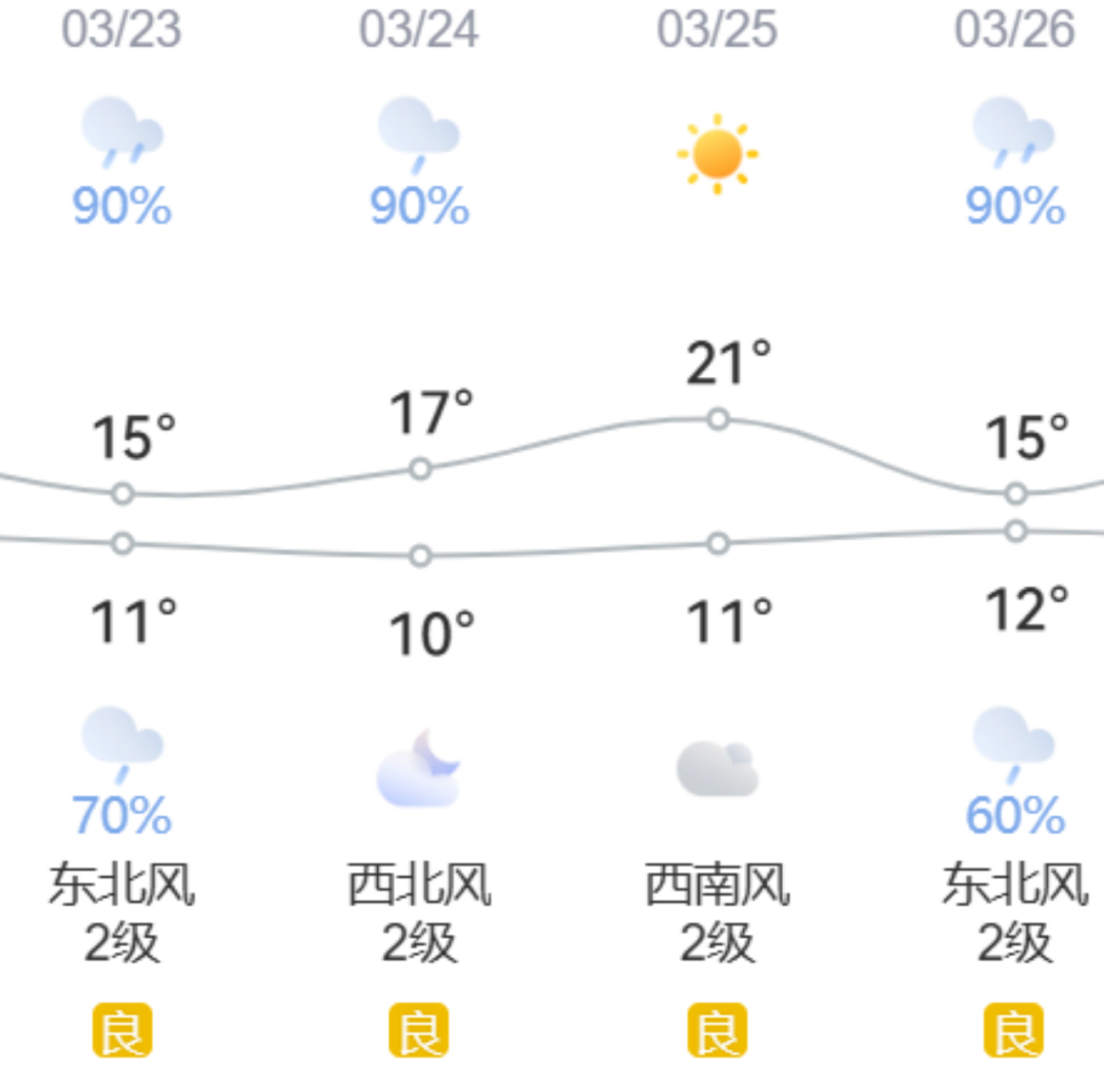 今天是2026年3月23日,星期一,中雨转小雨,温度11℃到15℃,空气质量类别为良。