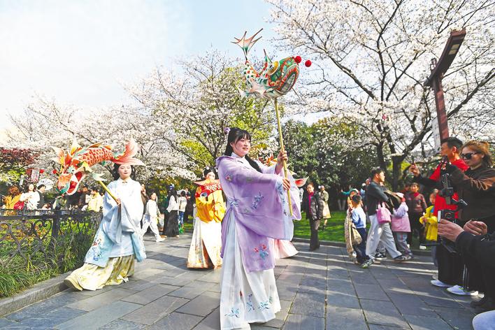 花千树 鱼龙舞 2026-03-23 09:58 0 3月21日,武汉堤角公园1300余株、22个品种樱花已进入盛花期。身着汉服的角色扮演者手持非遗传承人亲手扎制的鳌鱼灯、青鱼灯等,在花间舞蹈、游走穿行,尽显“花千树下鱼龙舞”的浪漫。 (湖北日报全媒记者 魏铼 通讯员 何梦宇 摄)