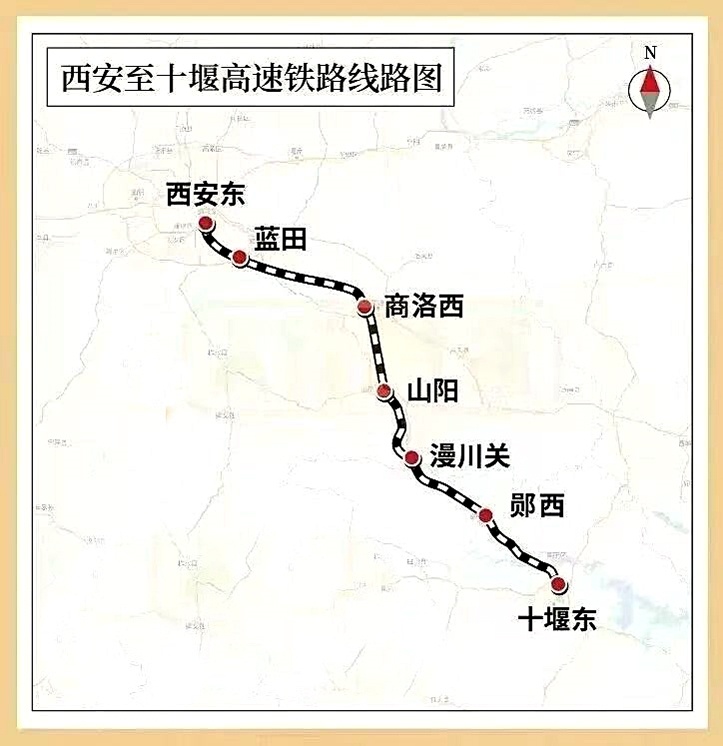 西十高铁西起陕西省西安市,自既有的西安东站引出,向东穿越秦岭山脉,经新建的蓝田、商洛西、山阳、漫川关等车站,进入湖北省新建的郧西站,到达既有十堰东站,设计时速350公里。