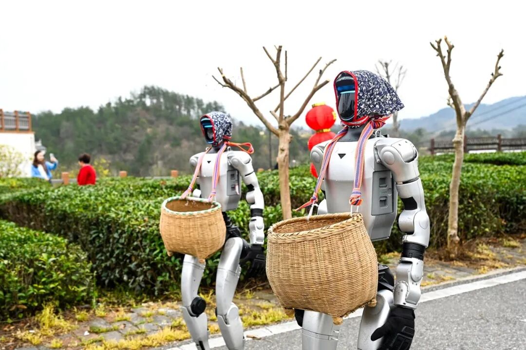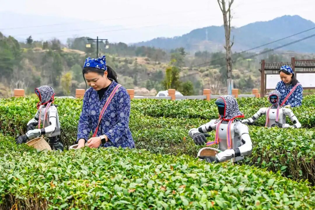 近日,在湖北省黄冈市英山县乌云山村茶园里,智能机器人与茶农一同进田采摘春茶,以科技手段助力春耕生产,为传统茶产业注入新动能。中新社供图