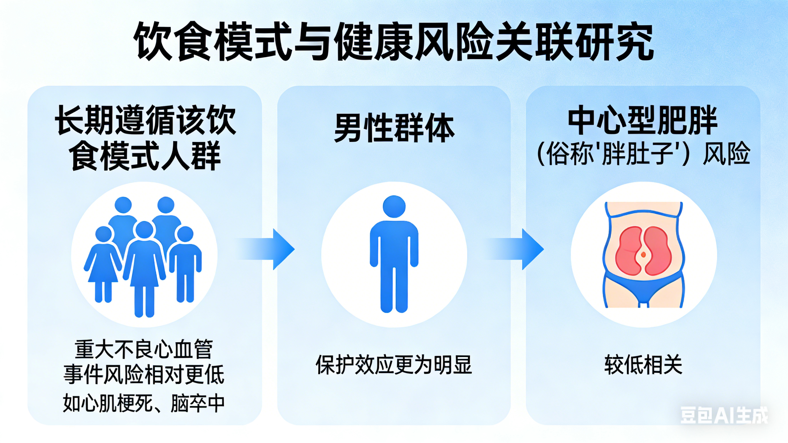 研究发现,长期遵循这种饮食模式的人群,发生重大不良心血管事件(如心肌梗死、脑卒中)的风险相对更低。在男性群体中,这种保护效应更为明显。同时,这一饮食模式也与较低的中心型肥胖(俗称“胖肚子”)风险相关。