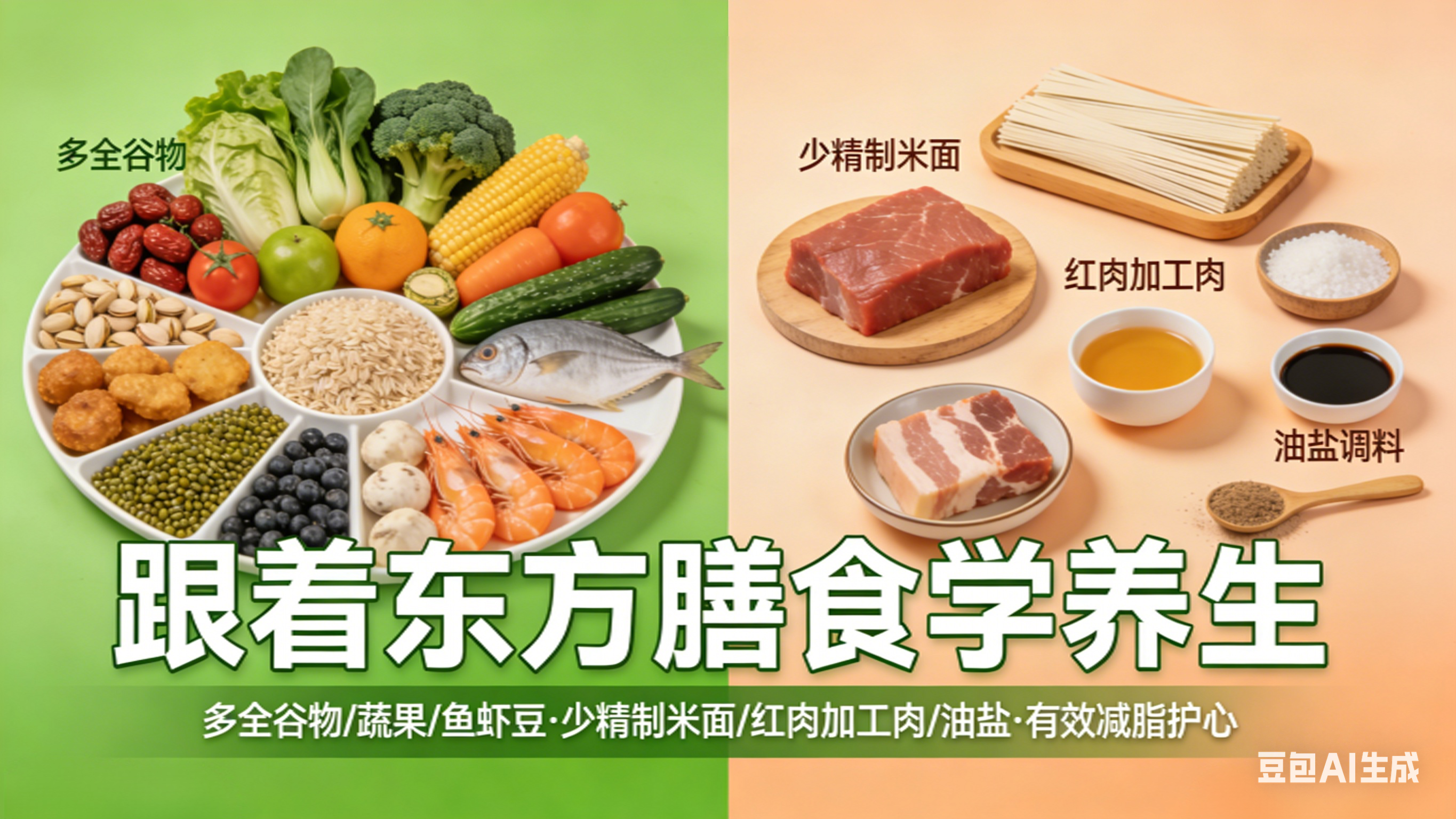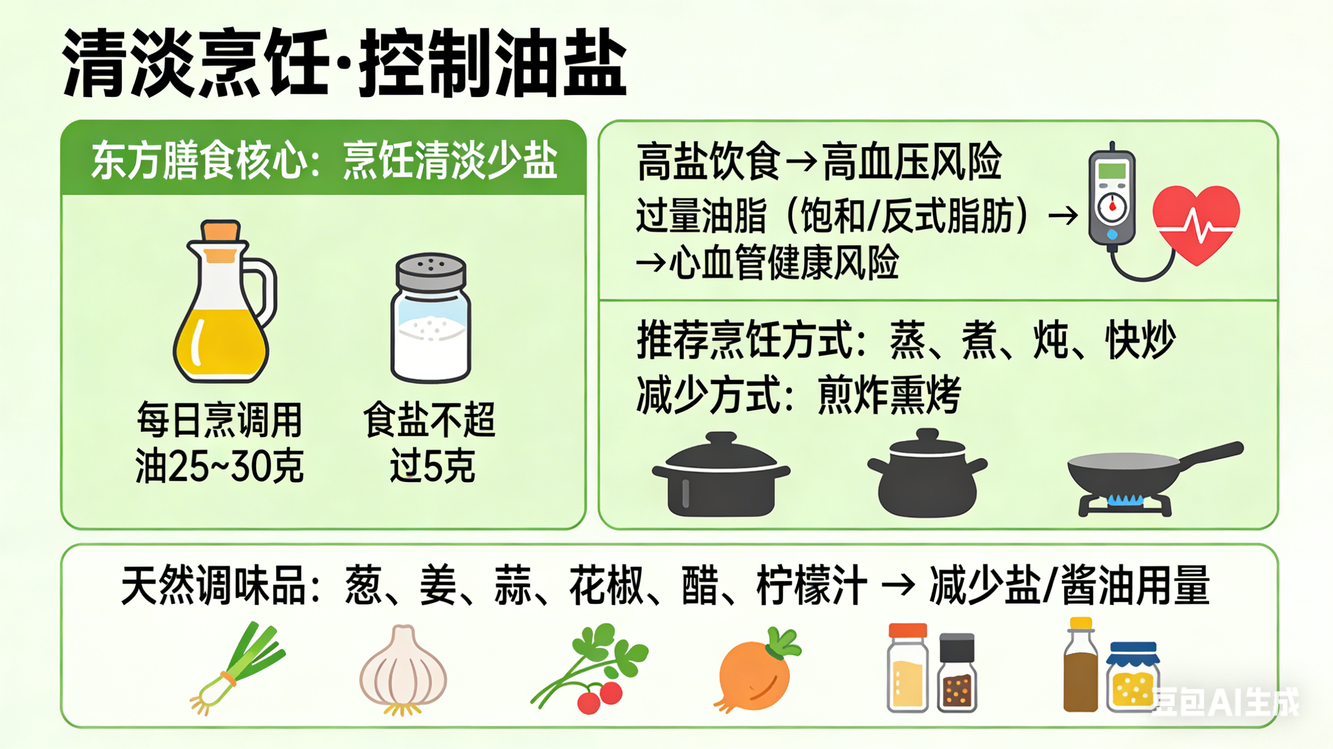 “东方膳食”强调烹饪清淡少盐。高盐饮食与高血压风险相关,而过量摄入油脂(尤其是饱和脂肪和反式脂肪)则不利于心血管健康。