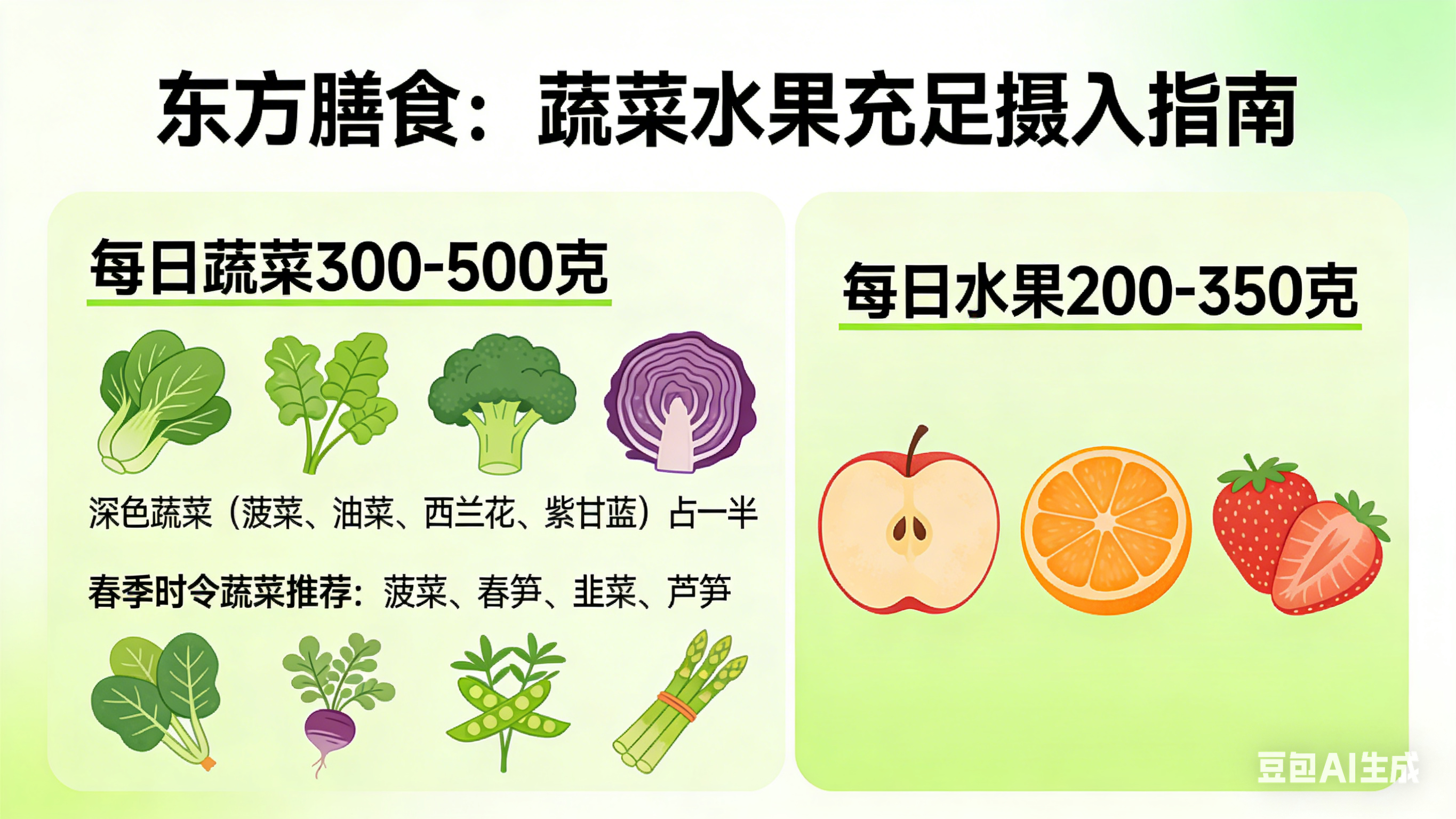 “东方膳食”强调蔬菜水果的丰富摄入。蔬菜水果提供维生素、矿物质、膳食纤维和多种植物化学物,对维持免疫功能、抗炎抗氧化有重要作用。