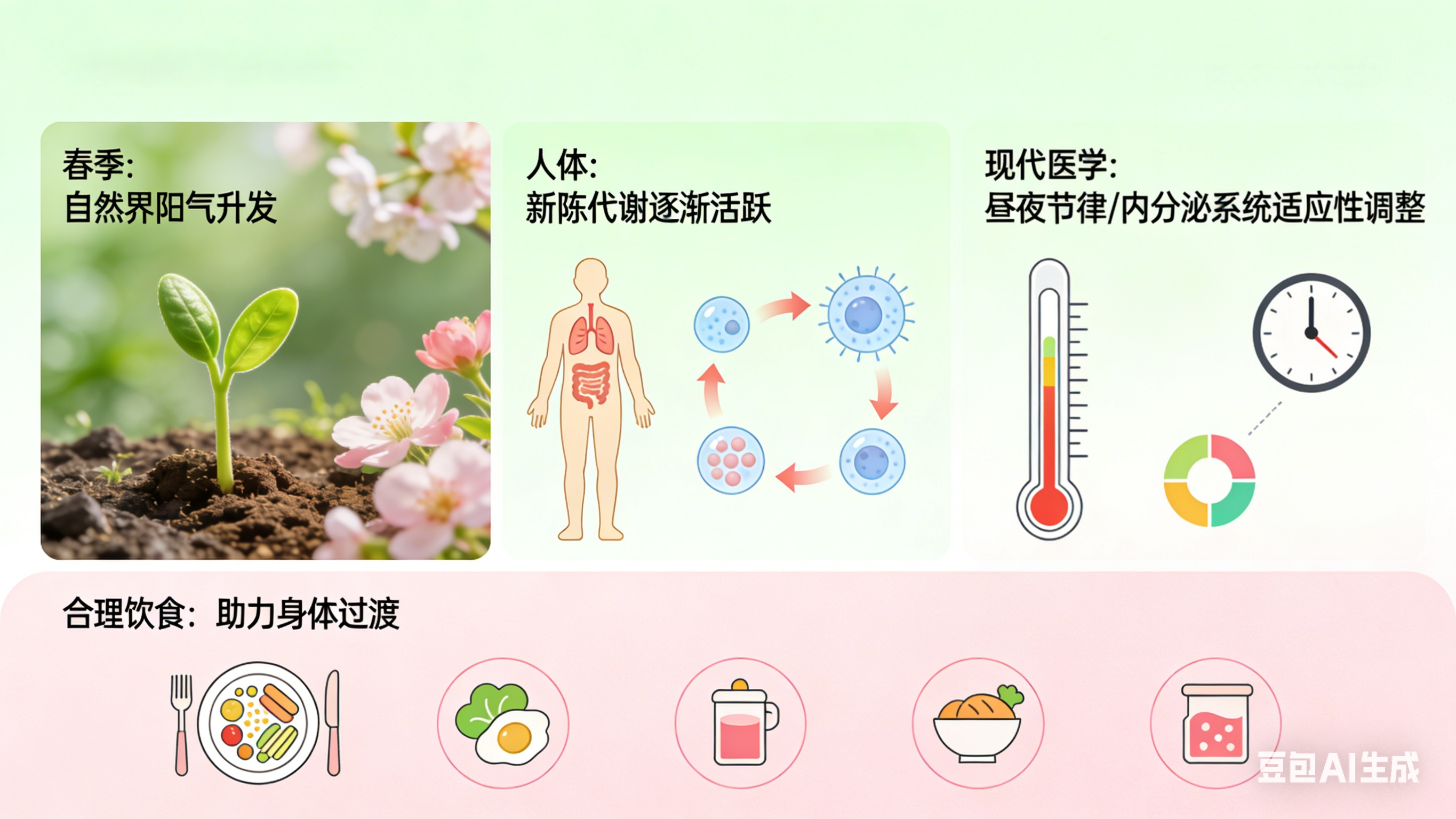 春季是自然界阳气升发的季节,人体的新陈代谢也逐渐活跃。从现代医学角度看,春季气温回升、日照时间延长,人体的昼夜节律和内分泌系统都会发生适应性调整。合理的饮食可以帮助身体更好地完成这一过渡。