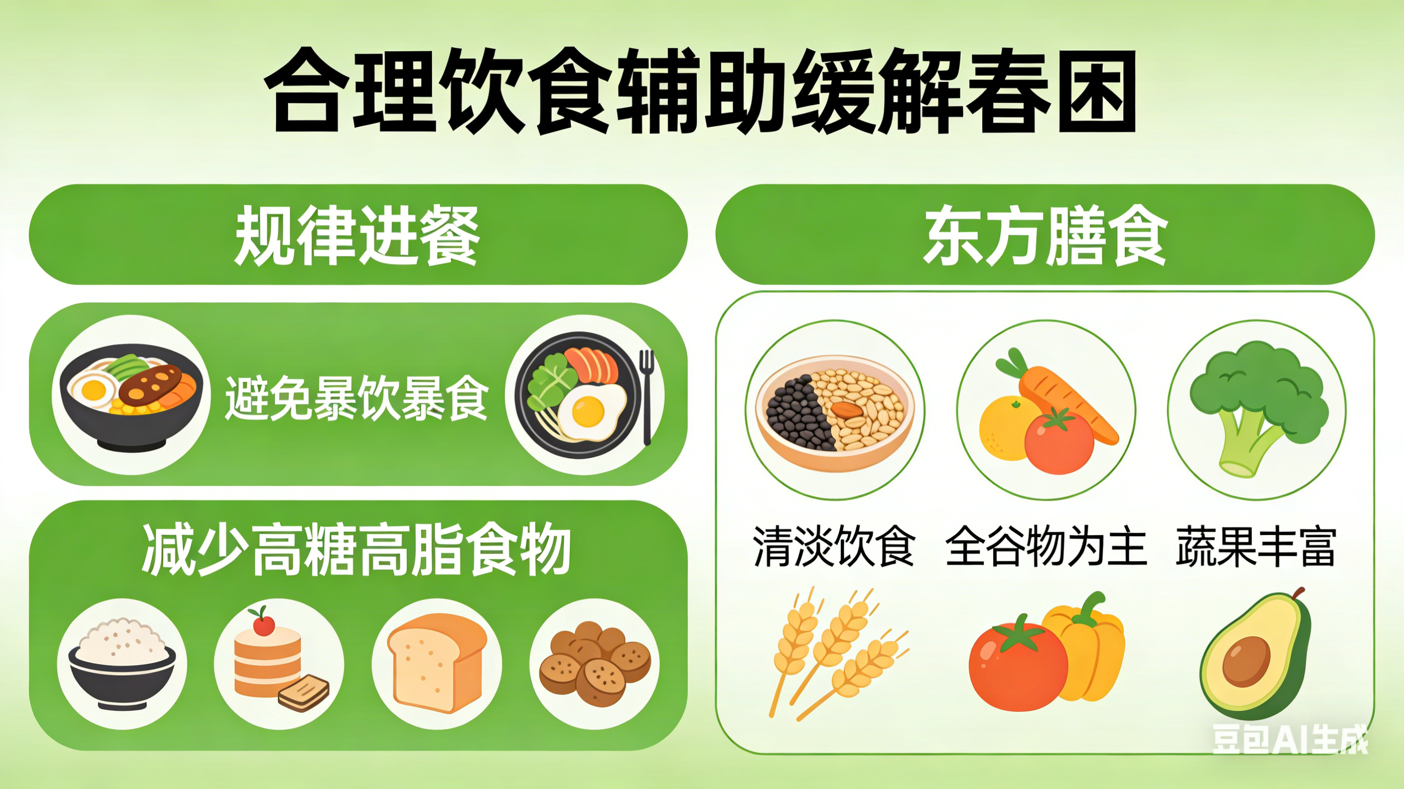 合理的饮食虽然不能直接“治愈”春困,但可以起到辅助作用:规律进餐、避免暴饮暴食、减少高糖高脂食物的摄入,可以减轻消化系统负担,避免餐后血糖剧烈波动带来的疲倦感。从这个角度看,“东方膳食”倡导的清淡饮食、全谷物为主、蔬果丰富的模式,恰好符合这些原则。