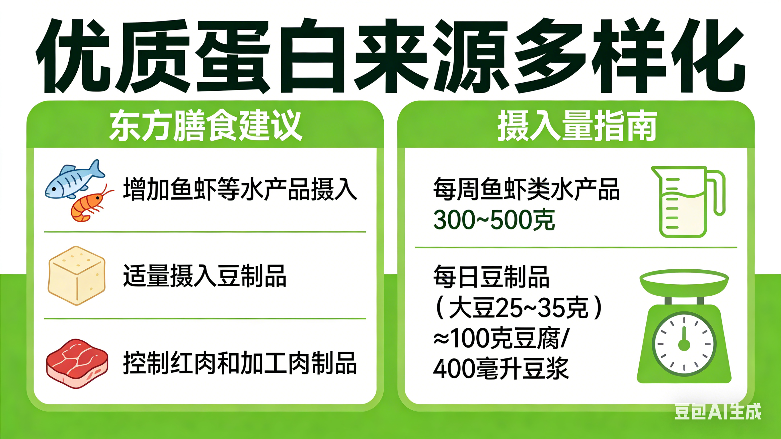 “东方膳食”提倡增加鱼虾等水产品的摄入,适量摄入豆制品,控制红肉和加工肉制品。鱼虾类富含优质蛋白和omega-3脂肪酸,对心血管健康有益;豆制品则是植物蛋白的优质来源,且富含大豆异黄酮等有益成分。