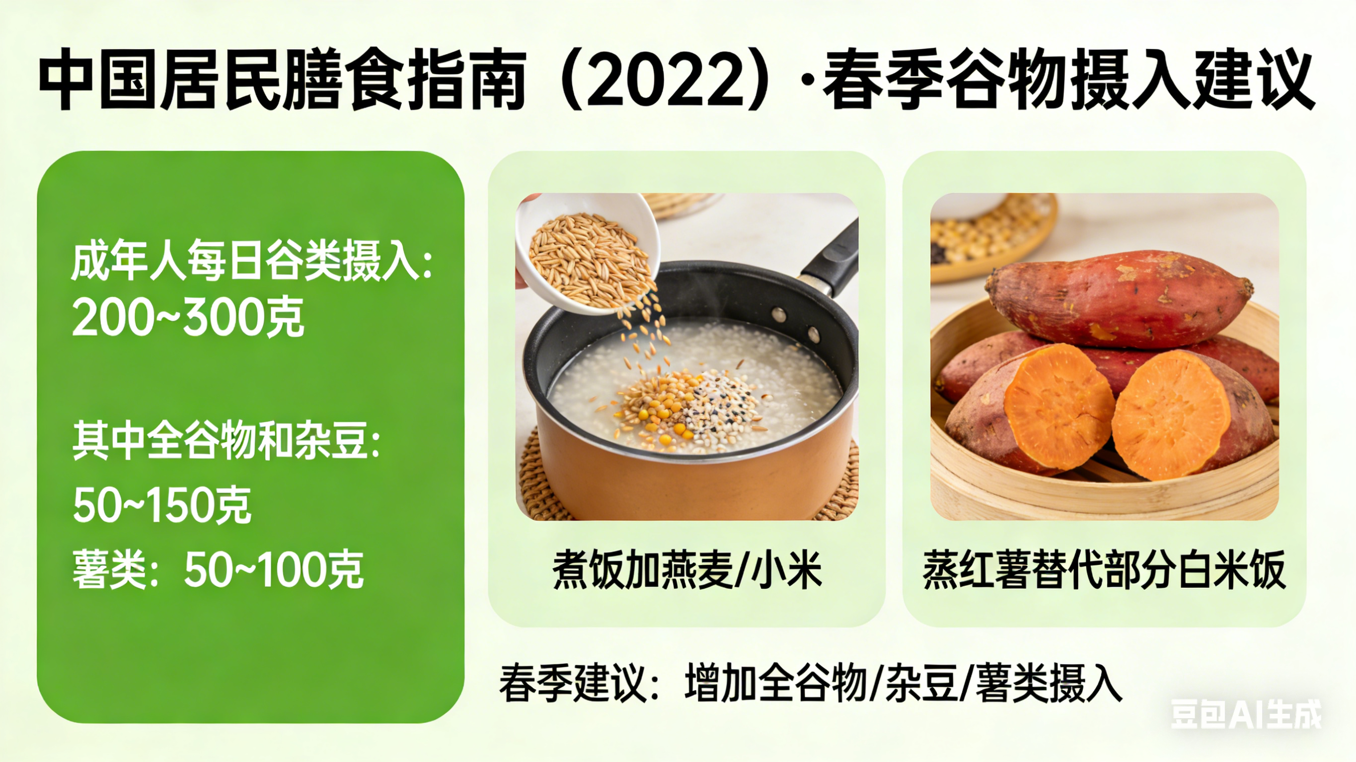 《中国居民膳食指南(2022)》建议,成年人每日摄入谷类200~300克,其中全谷物和杂豆应占50~150克,薯类50~100克。春季可以尝试在煮饭时加入一把燕麦或小米,或者用蒸红薯替代部分白米饭。