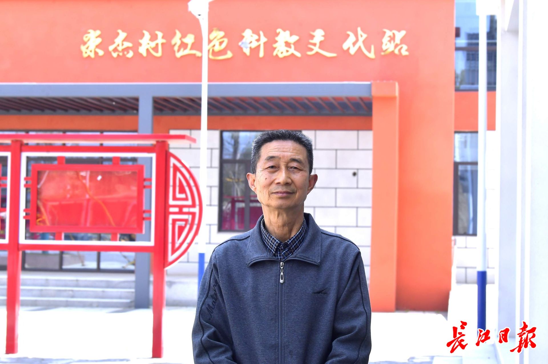 退休干部卢世嘉在崇杰村红色科教文化站前。记者刘斌 摄