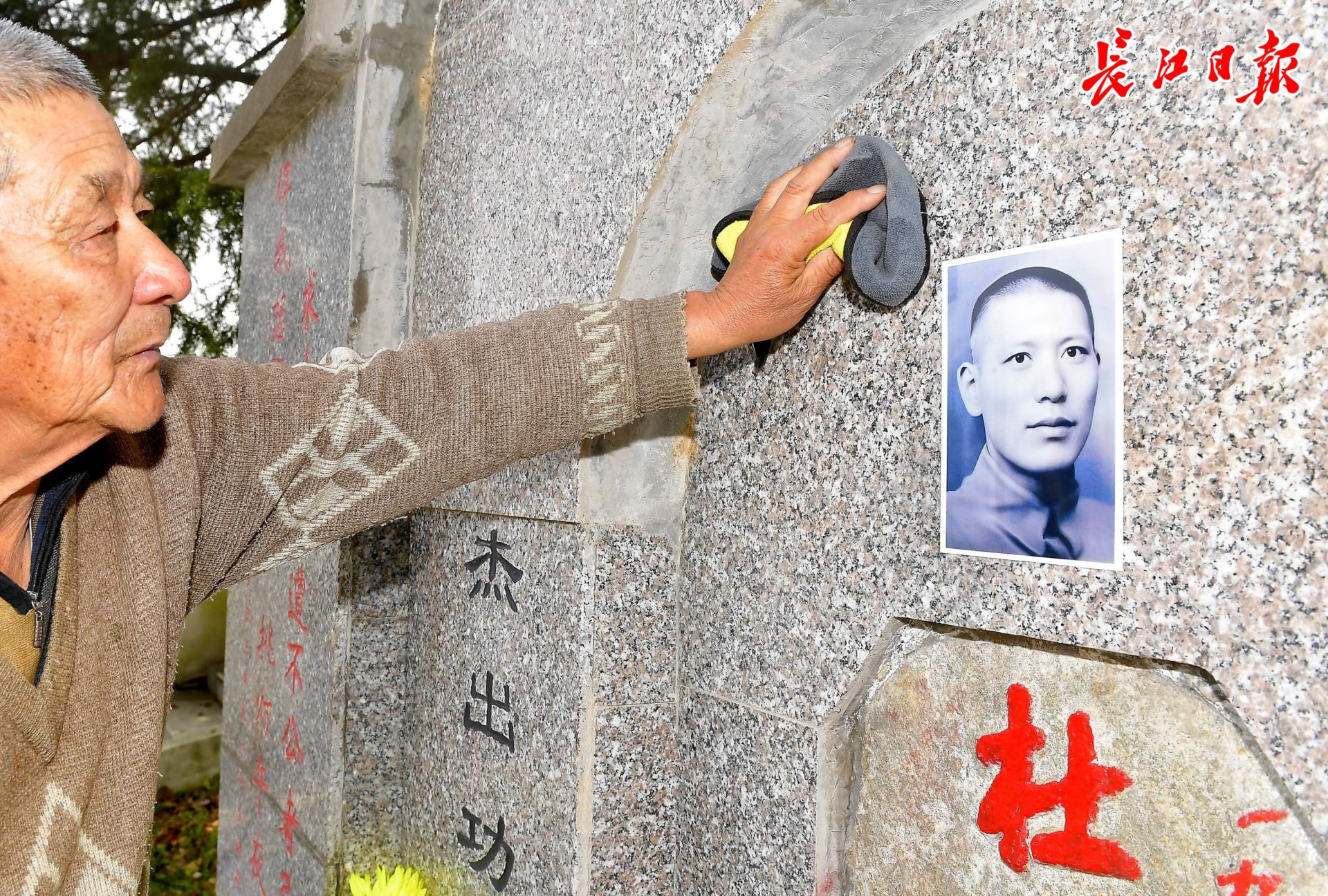 杜崇杰烈士陵园守墓人陈金国擦拭烈士墓碑。 记者刘斌 摄
