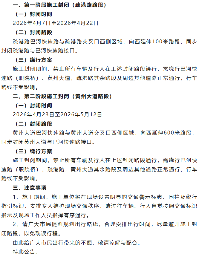 为保障燕矶长江大桥下层桥黄州大道上桥侧匝道工程顺利推进,切实维护施工期间道路交通秩序,保障过往车辆、行人通行安全,交管部门现就燕矶长江大桥匝道分阶段施工期间疏港路、黄州大道部分路段封闭管控事宜,公告如下: