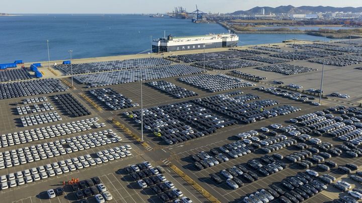 商品车在大连汽车码头整齐停放,等待装船发运。(受访者供图)