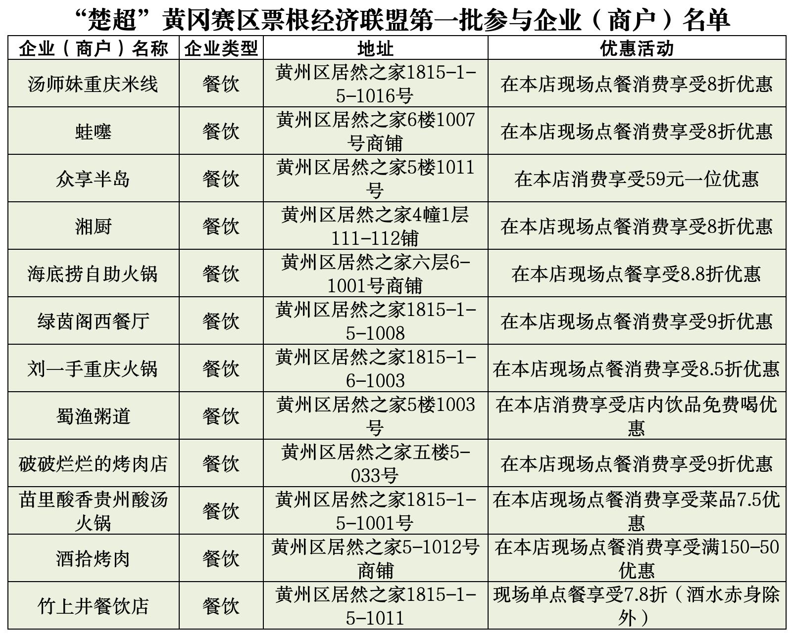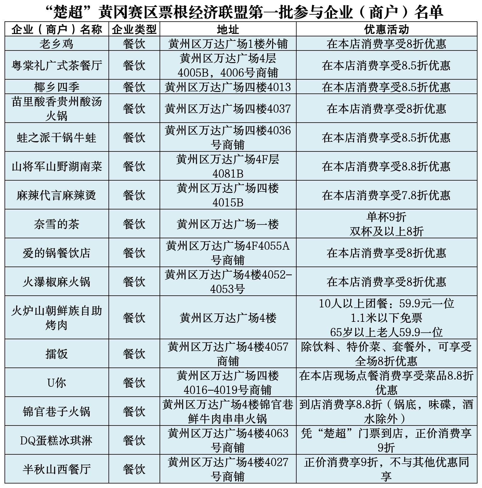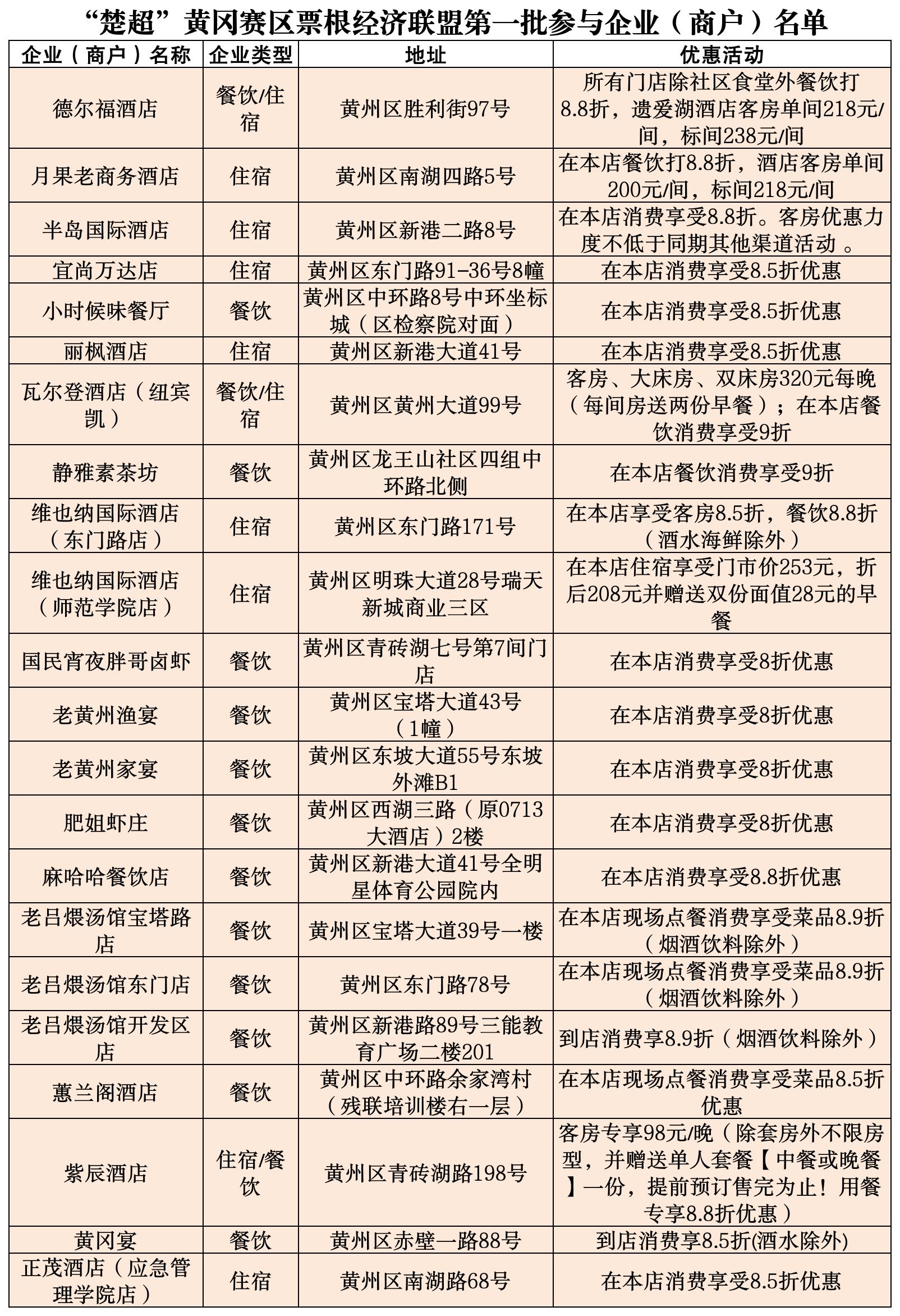 凭“楚超”黄冈赛区门票(电子票/纸质票均可)到店消费;