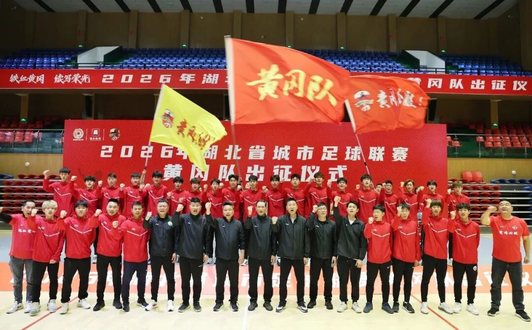 4月15日,2026年湖北省城市足球联赛黄冈队出征仪式在黄州体育馆举行,球队教练员、运动员及球迷代表齐聚现场,共同见证黄冈队正式踏上楚超赛场。