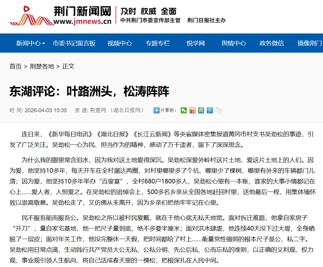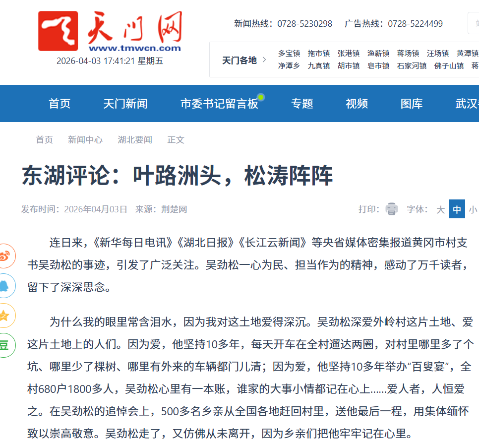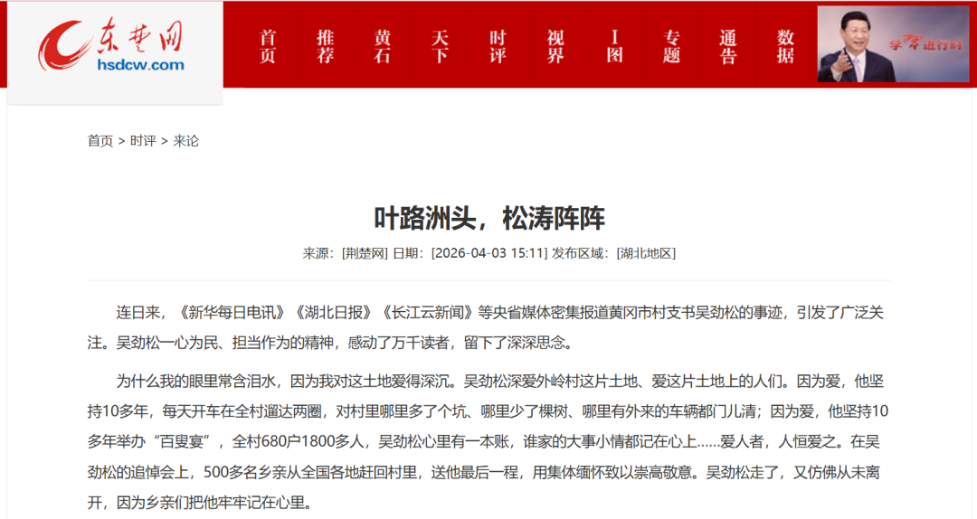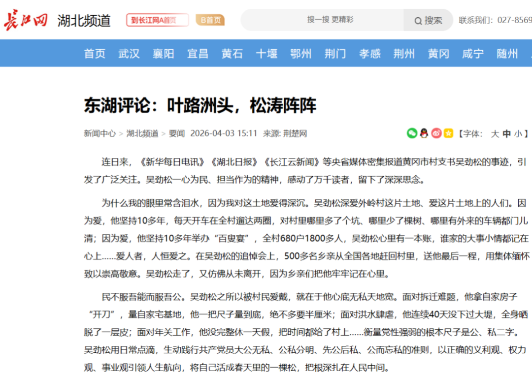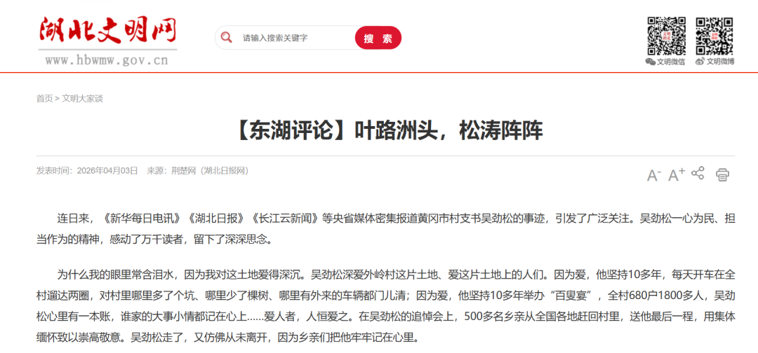连日来,《新华每日电讯》《湖北日报》《长江云新闻》等央省媒体密集报道黄冈市村支书吴劲松的事迹,引发了广泛关注。吴劲松一心为民、担当作为的精神,感动了万千读者,留下了深深思念。