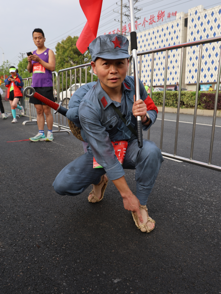 这位跑者名叫祝红杰,是红安上新集镇人。他身着全套红军军装,背上道具枪与大砍刀,脚踩一双草鞋,手中高高擎起“中国工农红军”旗帜,步伐坚定地奔跑在赛道上,每一步都饱含对革命先辈的崇敬之情。沿途跑者纷纷向他挥手致意、鼓掌点赞,不少人拿出手机记录下这一特别瞬间,赛道旁的市民也纷纷为他呐喊加油。