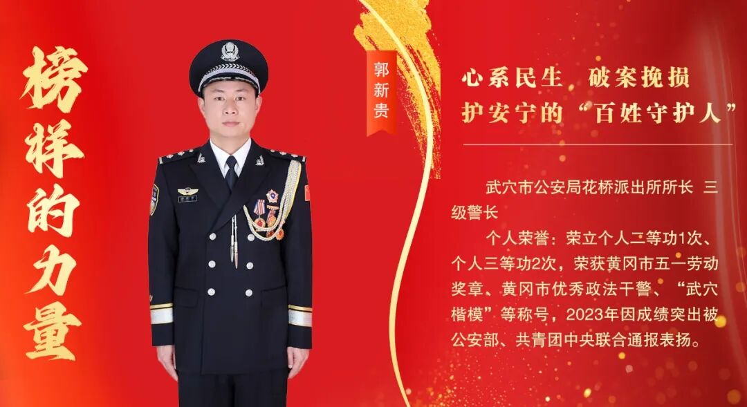 我叫郭新贵,现任武穴市公安局花桥派出所所长。从警15年来,我始终扎根基层一线,在刑侦破案、治安防控、服务群众的岗位上践行初心与使命。虽然组织上给了我很多肯定,但我知道,这些奖章的温度,来自战友们熬红的双眼、群众递来的那杯热茶,来自无数个并肩作战的寒夜与黎明。2024年8月到梅川派出所任职后,我和战友们深耕治理创新,辖区警情降了,发案少了,伤人、亡人事故也明显减少,相关经验事迹也被《人民公安报》等权威媒体多次报道。这些成绩的取得,离不开组织的培养、战友的拼搏和群众的支持。