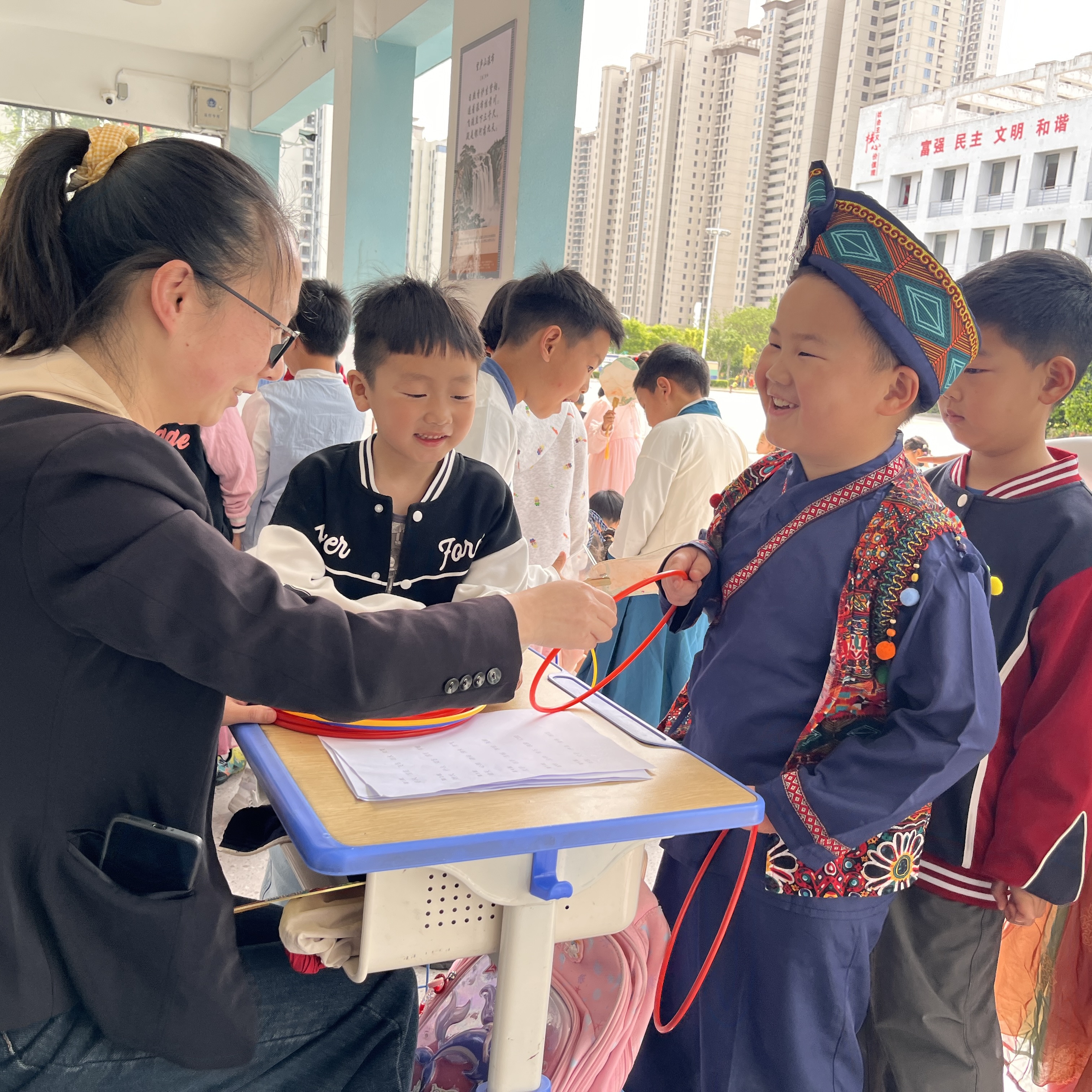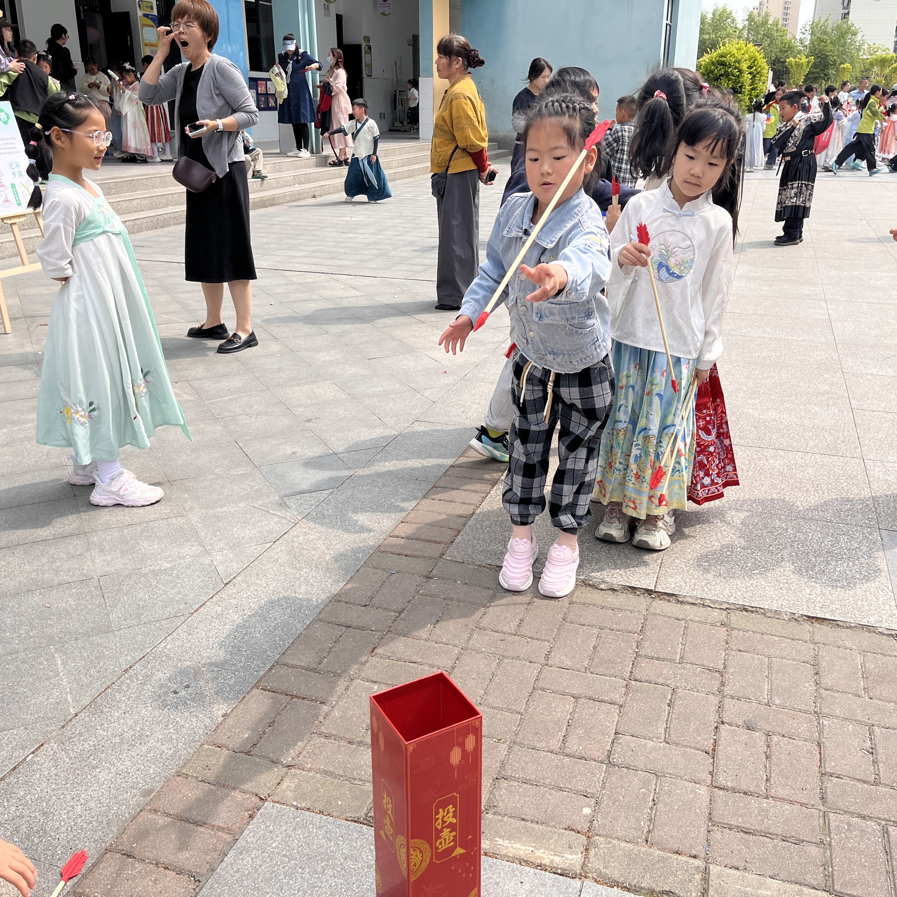 投壶区更是热闹非凡,孩子们有序排队、手持竹箭,瞄准壶口轻轻投掷,每一次成功投壶,都引来同伴的阵阵欢呼。