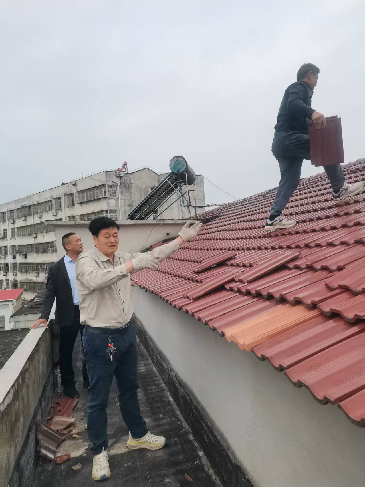 险情发生后,镇财政所退休副所长李焰兵第一时间将情况上报至所长汪见。汪见所长高度重视,迅速部署处置工作,立即安排分管后勤的副所长易长林赶赴现场,爬上屋顶实地勘察受损情况,同步联系专业泥工师傅到场开展抢修作业。