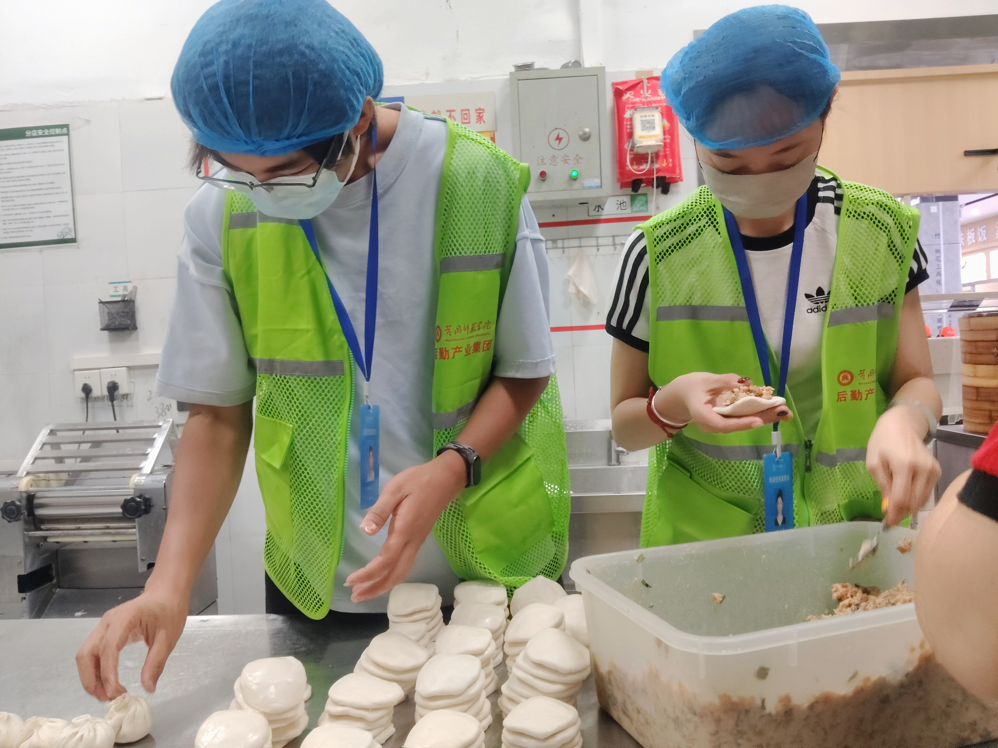 “面皮要中间厚边缘薄,馅料不能太多也不能太少。”在包子制作区,向顺顺和同学李晨滋跟着食堂师傅学起了“手上功夫”。起初,两人捏出的包子要么面皮破裂,要么馅料外露。“捏面皮力道要轻。”师傅手把手示范,经过反复练习,一个个圆润饱满的包子终于“诞生”,两人举着“作品”相视而笑:“以前觉得食堂师傅的工作很简单,现在才知道每一份餐食都藏着这么多用心。”