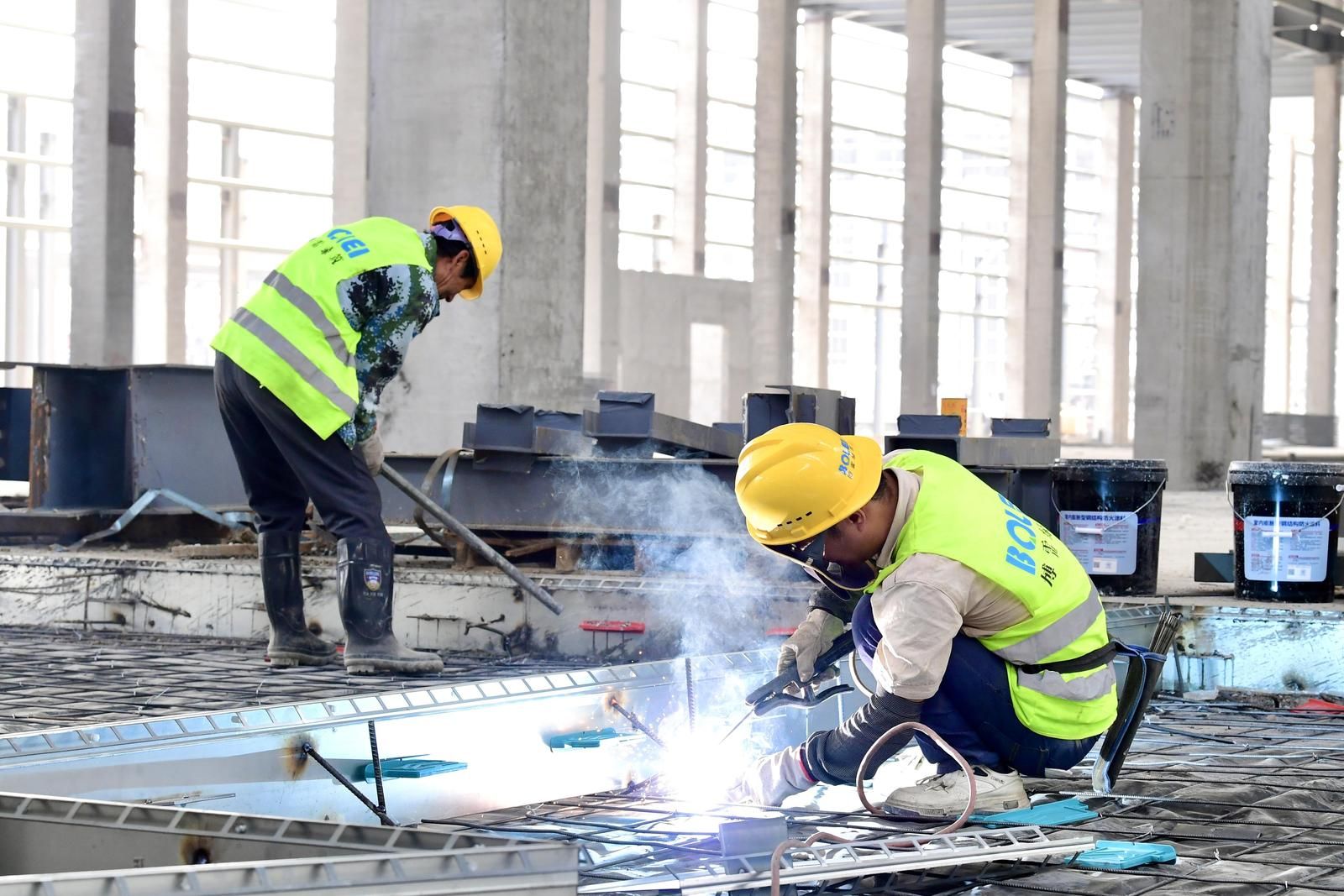 俯瞰1608亩建设工地,钢筋骨架撑起的现代化厂房在阳光照射下,泛着淡蓝色的光芒。