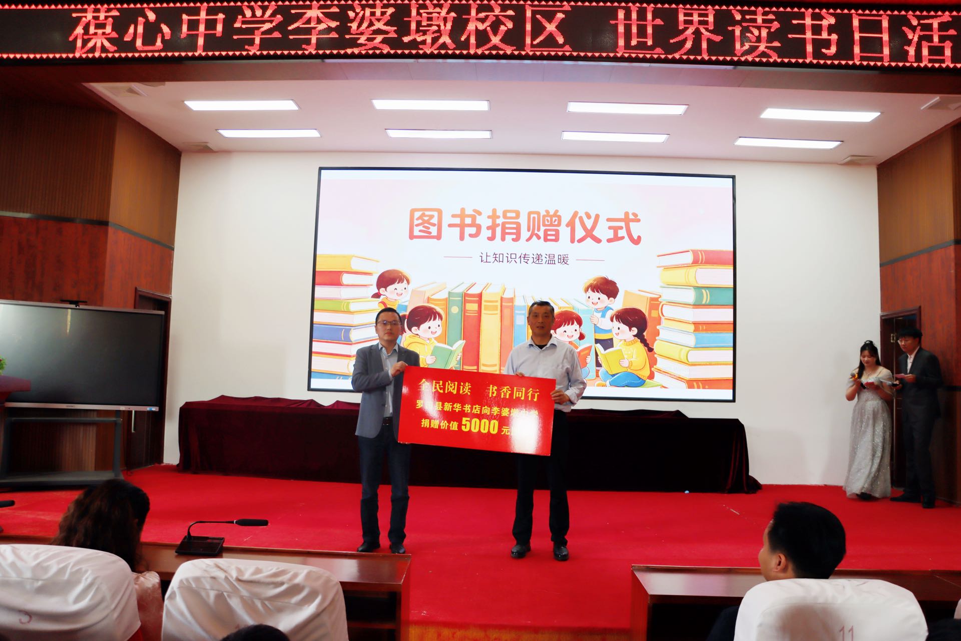仪式上,罗田县新华书店向葆心中学李婆墩校区捐赠价值5000元的精品图书,助力乡村教育提质,让书香陪伴学子成长。