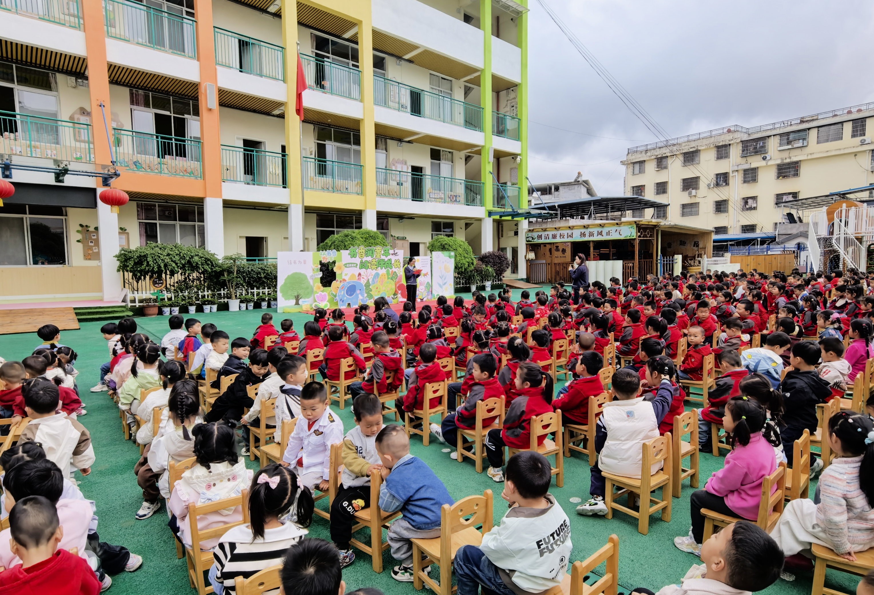 在庄严的国旗下,主持人向全体师幼介绍了世界读书日的意义,倡导大家爱上阅读、坚持阅读,正式拉开阅读节的序幕。幼儿代表分享了阅读乐趣,发出爱读书、多读书的真挚倡议;家长代表分享了亲子阅读心得,承诺用心陪伴、家园携手,共同打造书香校园。