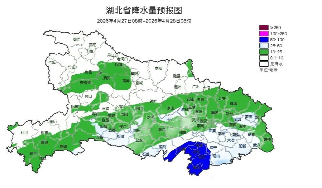 4月26日夜间至4月28日,湖北自西向东将会迎来一次降水过程,南部地区会有中到大雨,局地暴雨。
