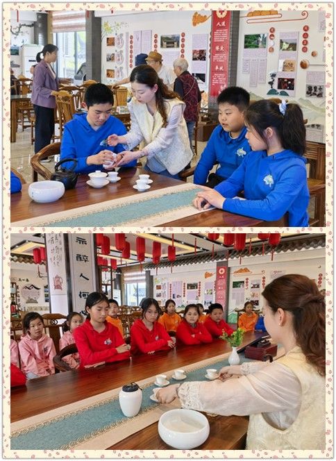 随后,孩子们走进茶艺课堂,在茶艺师指导下学习温杯、投茶、注水、出汤等规范流程,练习敬茶礼、品茶礼,体悟“和、敬、怡、真”的茶道精神,感受中华茶文化的雅致与礼仪之美。