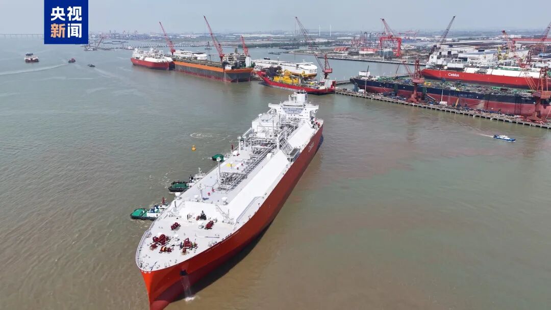 我国自主设计建造的最大液化天然气(LNG)运输船“乔治敦”号在江苏南通交付,从长江南通段离泊,驶往新加坡。