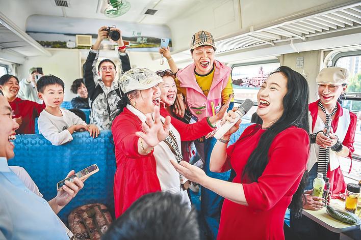 湖北日报讯 (记者胡祎、通讯员刘娟、陈俊)“洪湖水呀,浪呀嘛浪打浪啊……”4月26日上午,一声清脆悠扬的歌声,从5856次“武昌至武昌”环线列车的车厢里飘出。演唱者是湖北省歌剧舞剧院艺术工作者、歌剧《洪湖赤卫队》第四代“韩英”扮演者马娅琴。1号车厢里,旅客不约而同停下交谈,纷纷举起手机,定格这趟旅途中的惊喜。当天,这趟列车共载有1600多名旅客,记者也置身其中,记录下这满车厢的歌声与欢笑。