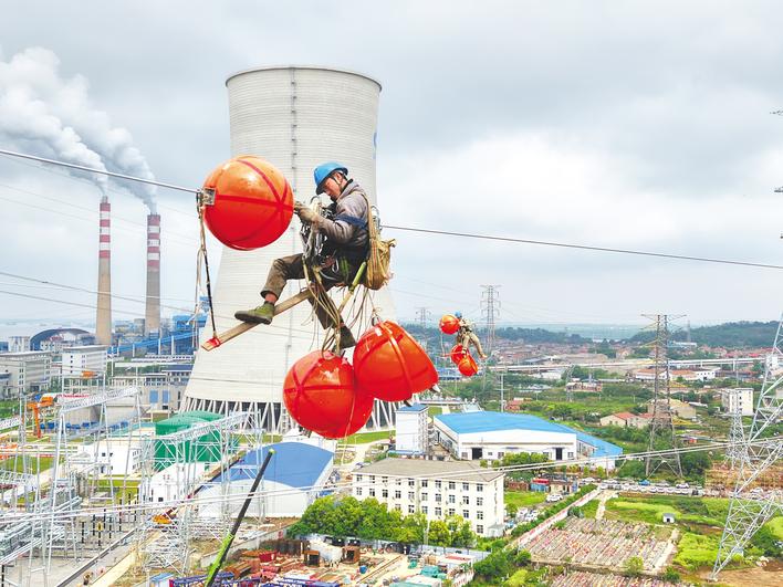 4月24日,鄂州电厂220千伏线路改造现场,电力工人在60米高空地线与光缆上安装航空标识球。