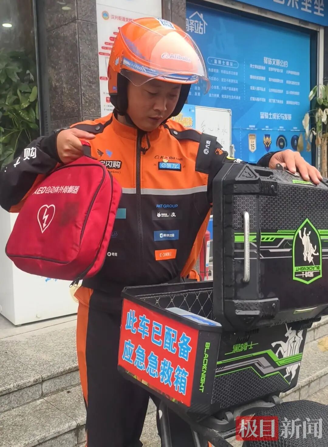 张宝剑送餐刚好经过。他立刻停下车,打开外卖箱,取出那台AED,跪在老人身边。