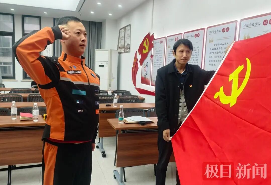 2025年10月30日,张宝剑面对鲜红党旗,从预备党员转为正式党员。“车铃响,那是我们穿梭在街头忙碌的身影。党旗红,那是我们坚守在心中的信仰。”