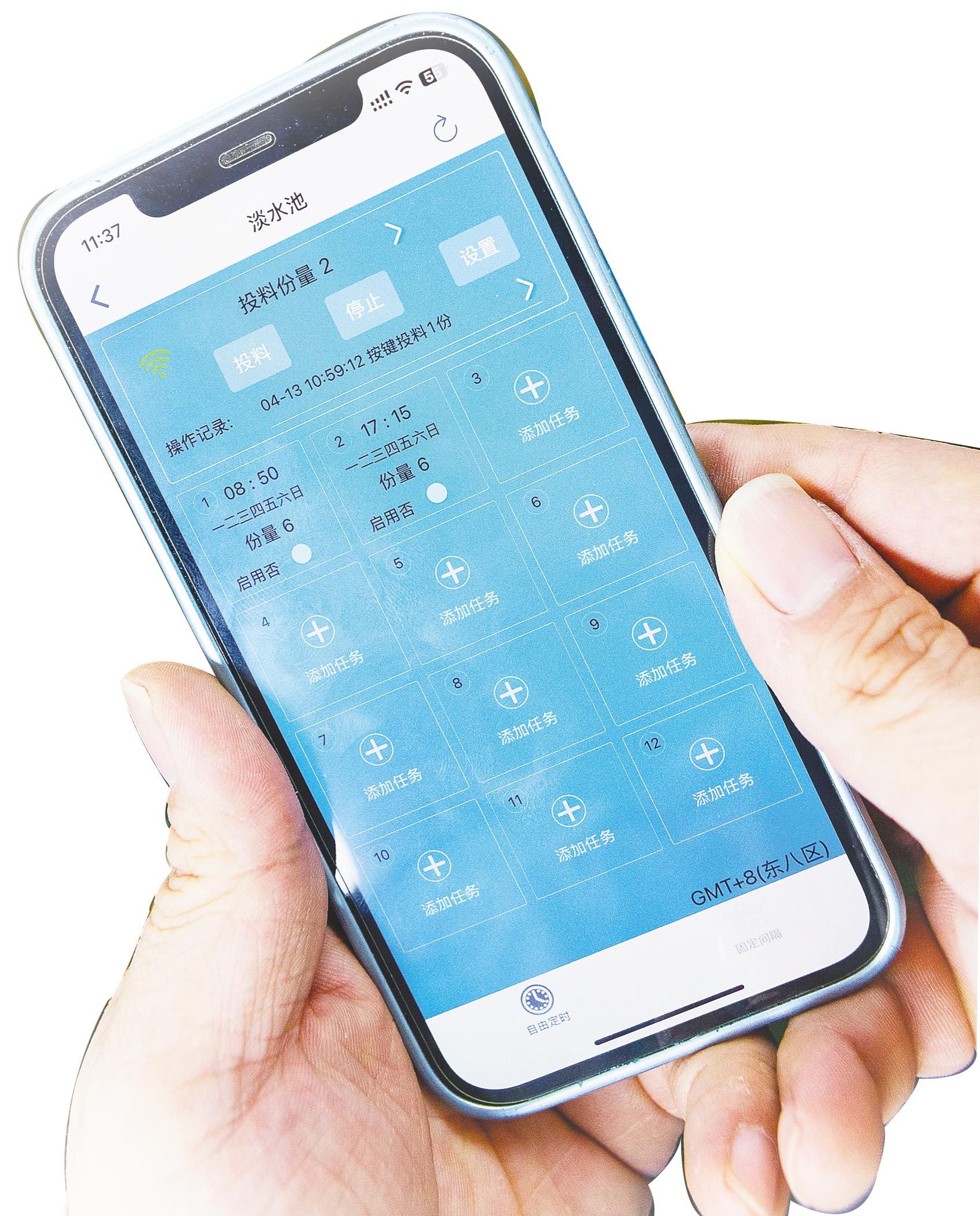 武汉中科瑞华生态股份有限公司科研人员操作智能系统喂养鱼食。 (湖北日报全媒记者 薛婷 摄)