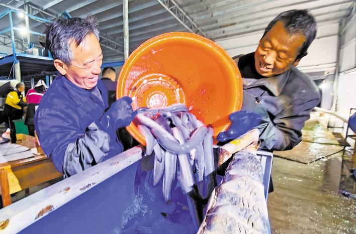 工人正在分拣鳗鱼。 (湖北日报通讯员 温宜飞 摄)