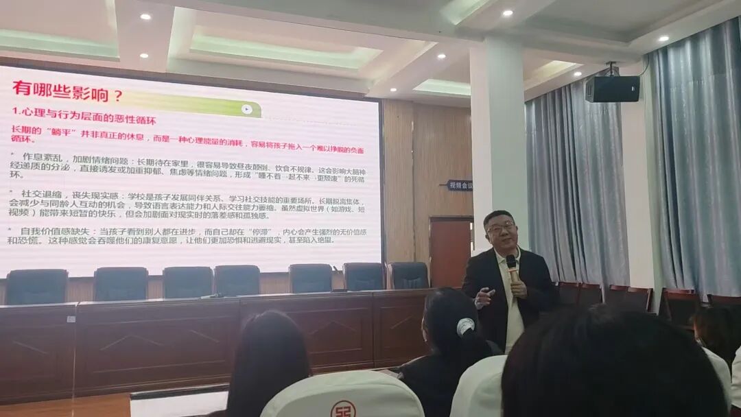 讲座伊始,江泽老师以“孩子不上学躺家里时间过长,会有哪些影响?”这一贴近现实的问题引发家长们的思考。他指出,初中阶段是孩子身心发展的关键时期,长期“躺平”且缺乏干预,不仅会造成学业倒退,更会对孩子的心理健康、社会适应能力和未来生存能力造成严重损害:作息紊乱加剧情绪问题,社交退缩丧失现实感,自我价值感缺失陷入绝望,学业断层带来挫败感,人格也易走向极度脆弱或极度叛逆的两端。江老师强调,初中阶段的“躺平”并非休息,而是“人生提前停摆”,家长既不能放任自流,也不能硬逼猛催,关键要在情感接纳与行为边界间找到平衡。