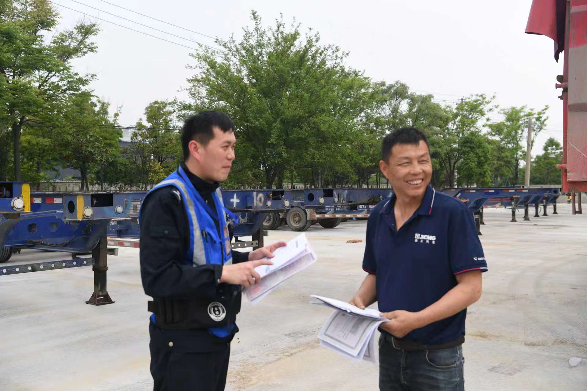 4月27日,黄冈市公安局交通管理支队车管所的民警辅警主动走进南湖路雄风科技园,为黄冈启程物流有限公司提供上门验车服务,一天就高效完成10辆重型集装箱半挂车的查验工作,把服务直接送到了企业家门口,省去了企业来回跑的麻烦。