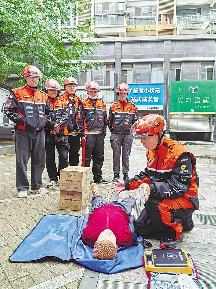 4月23日上午,武汉市江汉区汉兴街道玉兰里社区骑士驿站门口,十几位骑手围成一圈,圈中的张宝剑跪在一个模型人旁,身体前倾,胳膊绷直,边按压边数。数到30,他抬头:“吹两次气,再继续。”