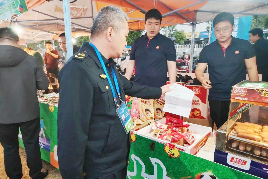 赛中,市场监管骨干全员到岗,在体育中心周边全程巡查监管,重点查验食品经营商户从业人员的健康证明,对其规范穿戴、食材进购、加工环境等方面进行细致检查,督促摊贩严格落实食品安全规范,确保球迷饮食安全。