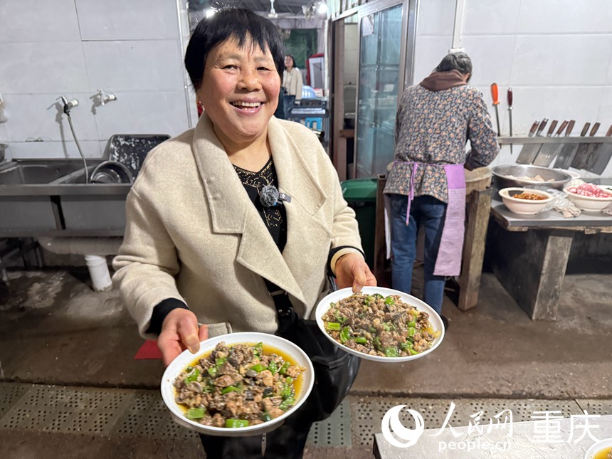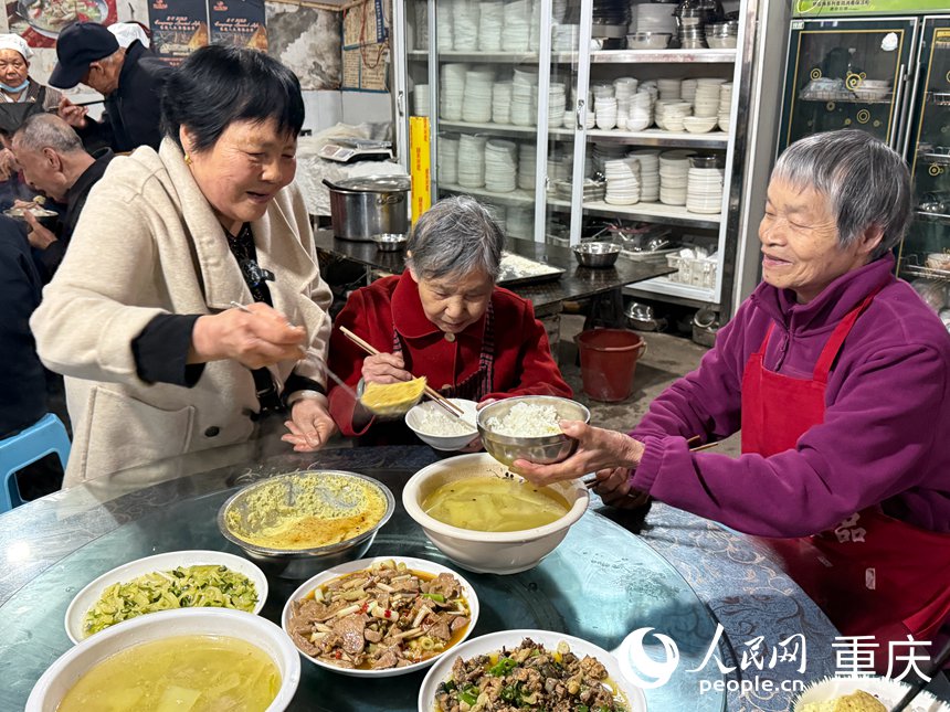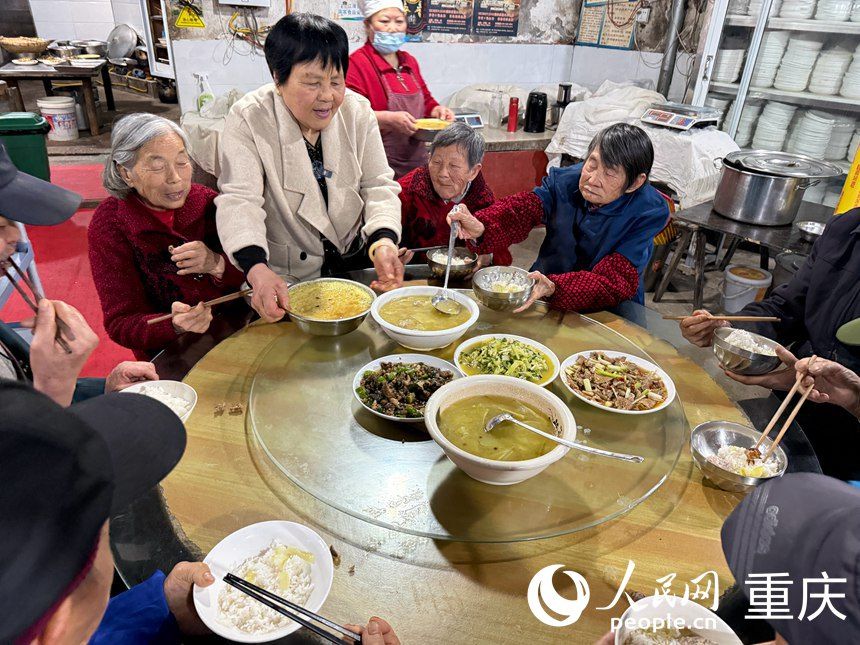 泡椒炒猪肝、尖椒炒鸡、蒸芙蓉蛋、黄瓜肉丸汤……冒着热气的家常菜陆陆续续端上桌,老人们的脸上洋溢着幸福的笑容。