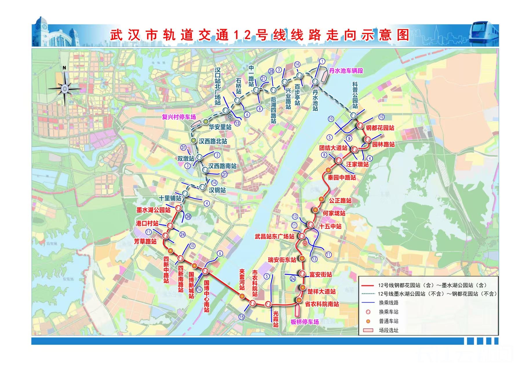 12号线一期工程线路全长35.32公里,共设23座车站,起于钢都花园站,止于墨水湖公园站,途经园林路站、团结大道站、汪家墩站、秦园中路站、公正路站、何家垅站、十五中站、武昌站东广场站、瑞安街东站、富安街站、楚祥大道站、省农科院南站、光霞站、市农科院站、夹套河站、国博中心南站、国博新城站、四新南路站、四新中路站、芳草路站、港口村站,单程行驶时间约58分钟。其中,园林路站、汪家墩站、武昌站东广场站、光霞站、国博中心南站可换乘4、5、6、7、8、11、16号线,武昌站东广场站与4/7号线武昌火车站为虚拟换乘。线路途经青山区、武昌区、洪山区、汉阳区四大行政区。线路开通后,将极大便利沿线居民的出行。